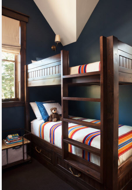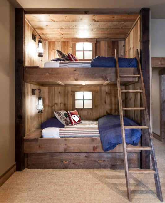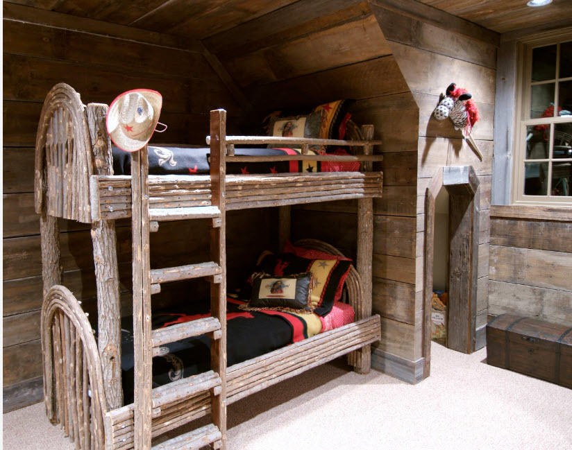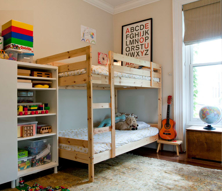 Традиционная модель двухъярусной кровати – универсальный предмет мебели, который органично впишется в любой интерьер детской комнаты. Если говорить о самом универсальном способе создания классической двухуровневой кровати, то можно использовать в качестве материала натуральное дерево, оставив красивый природный рисунок древесины в качестве расцветки. Дерево легко сочетается с большинством оттенков цветового спектра и всегда привносит теплоту и уют в интерьер помещения.