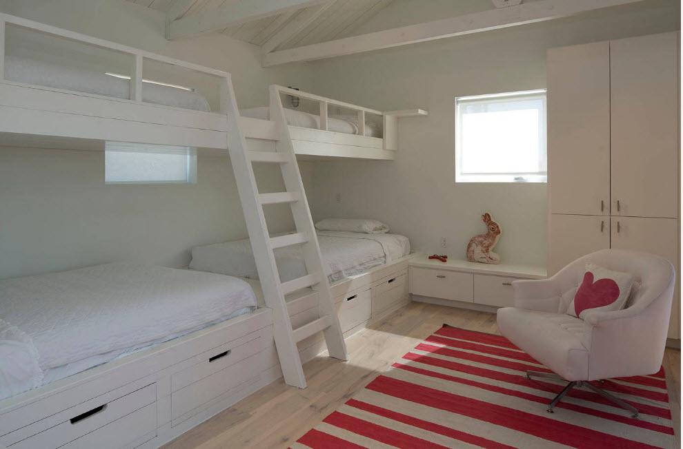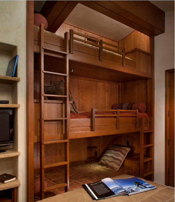 Модель кровати с двумя спальными местами, расположенными в два яруса может быть использована не только для организации зоны сна и отдыха в детских комнатах. Этот универсальный способ экономии полезного пространства может быть использован в частных домах для организации спальных мест в комнате для гостей. «Спрятать» два яруса спальных мест можно в шкафу гостиной и открывать его по необходимости.
