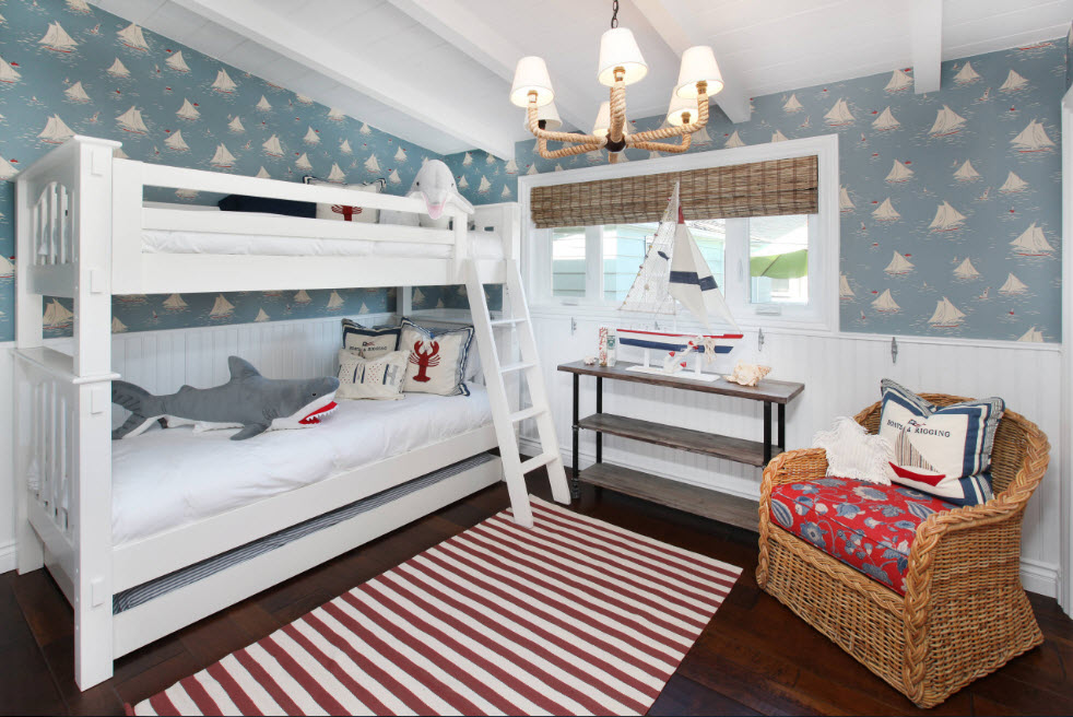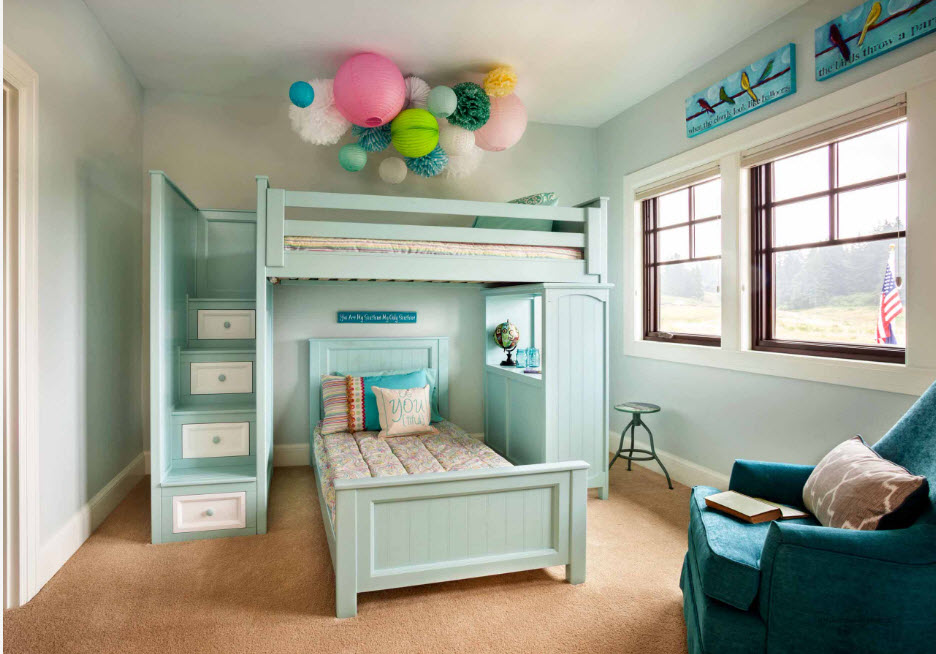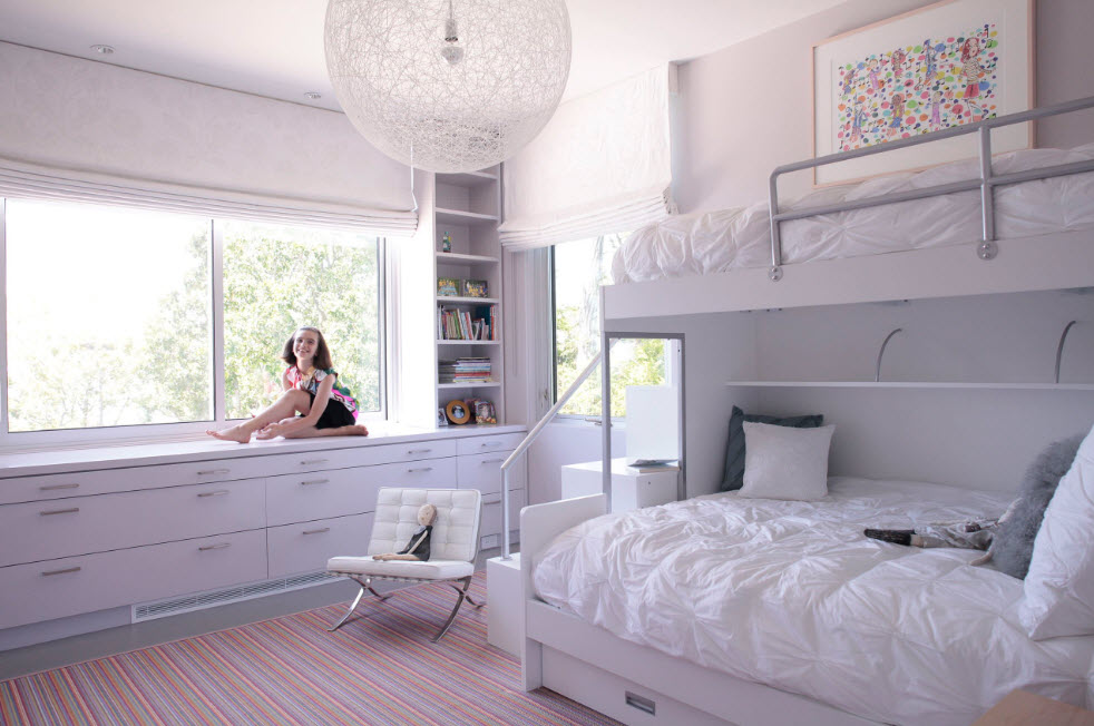 В большинстве случаев двухъярусная кровать располагается вдоль одной из стен комнаты, иногда – в нише или в случае с узкой комнатой – между двух стенок. Но в просторном помещении высокую кровать в два яруса можно использовать в качестве зонирующего элемента, для разделения комнаты на функциональные сегменты. Учитывая, что в помещении проживают как минимум два ребенка, создание своей зоны для каждого из детей станет отличным способом распределения пространства.
