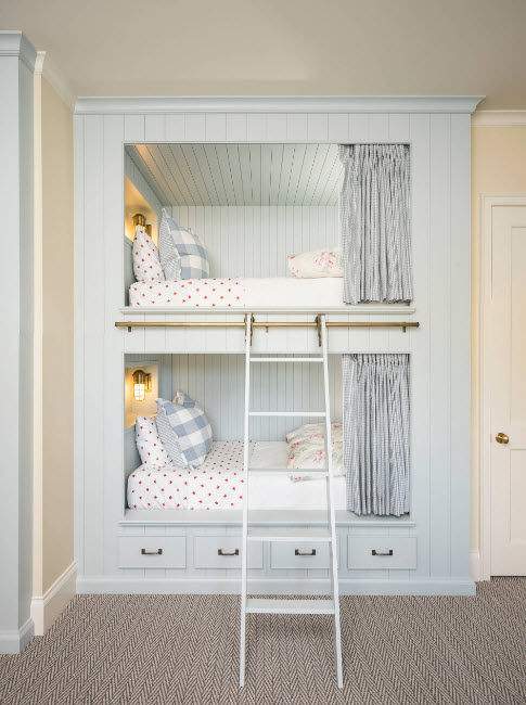 Иногда для того чтобы создать приватную зону для сна и отдыха, достаточно оснастить оба уровня двухъярусной кровати шторками. Такой способ подходит для встроенных конструкций и моделей, имеющих стенки с двух сторон.