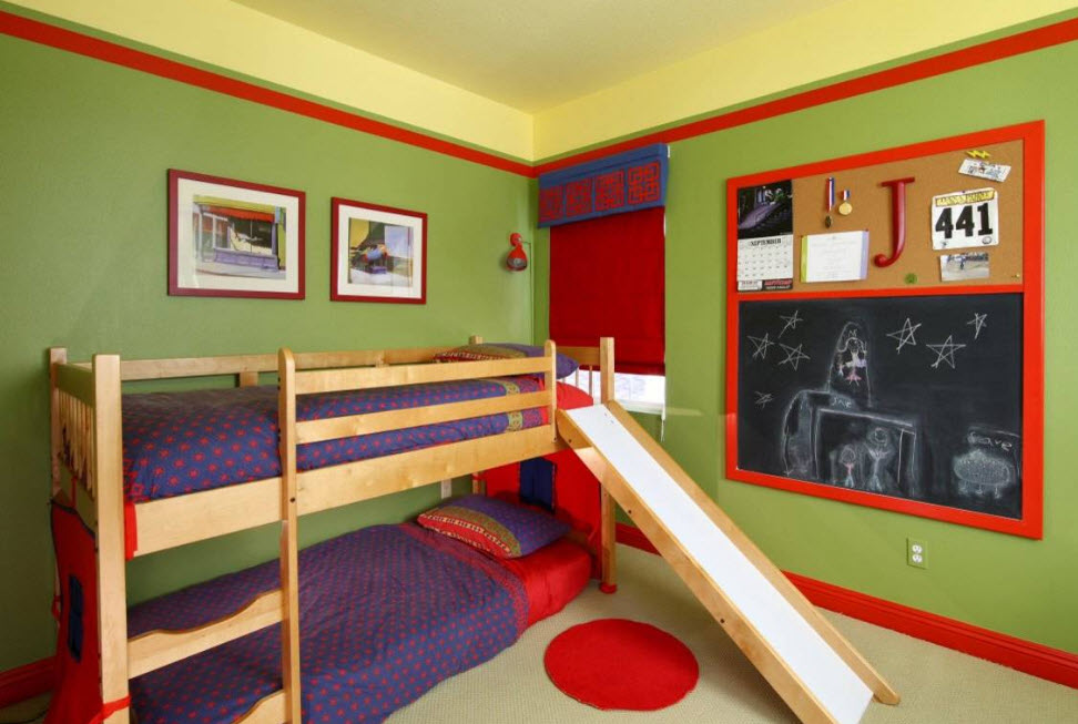 Если места в детской достаточно, кровать можно дополнить горкой. При этом лесенка для поднятия на второй этаж должна быть обязательно. Обычная двухъярусная кровать становится игровым комплексом.