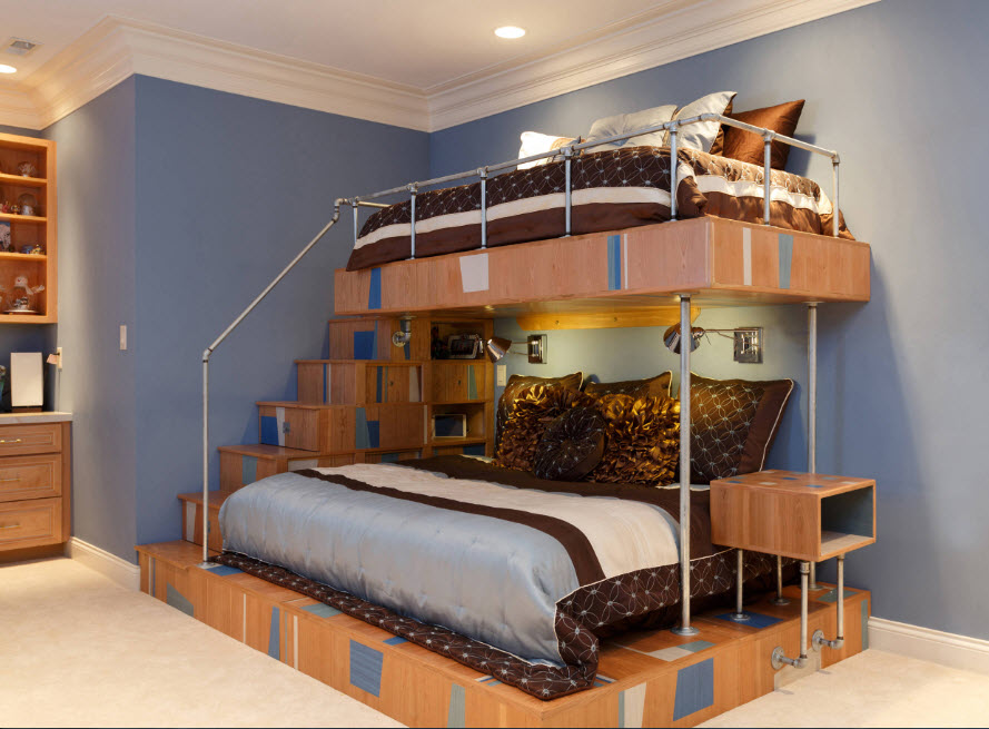 В некоторых случаях необходима покупка модели двухъярусной кровати, в которой нижний уровень представлен двуспальным ложе, а верхних – рассчитан на одного ребенка. Модель не самая компактная, все же двуспальная кровать требует больше полезного пространства комнаты, но в некоторых случаях именно такое расположение спальных мест является оптимальным для конкретной семьи. Верхний ярус в такой кровати может располагаться параллельно нижнему…