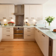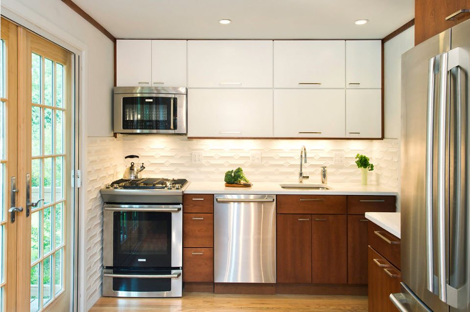 Оттенить кухонный гарнитур белого цвета можно с помощью приборов из нержавеющей стали и бытовой техники. А кухонный фартук из крупной плитки с мраморными разводами здесь будет идеальным связующим компонентом.