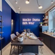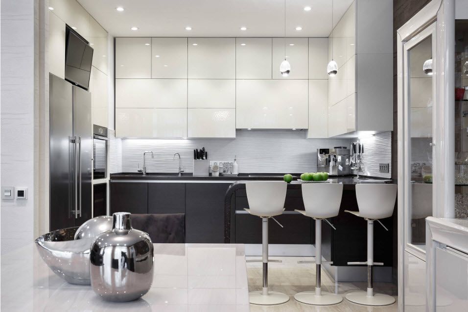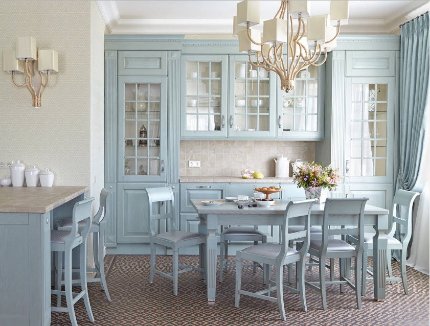 А здесь белый глянцевый фартук в виде кирпичной кладки органично сливается с верхним гарнитуром, выдвигая на первый план яркие желтые стулья и синие фасады в нижней части. Изюминка интерьера – выразительные светильники в стиле лофт над обеденной зоной.