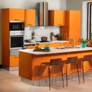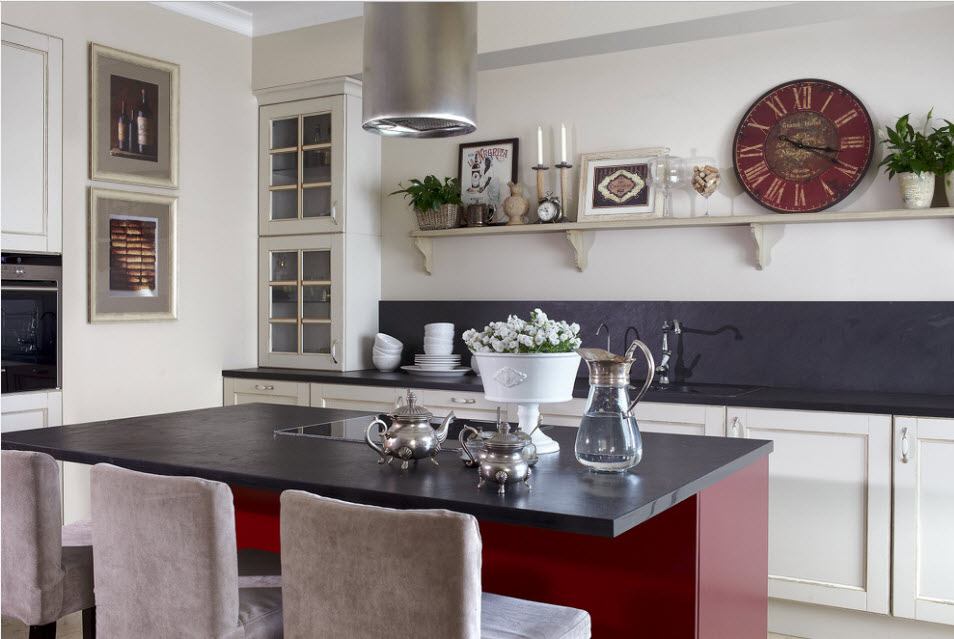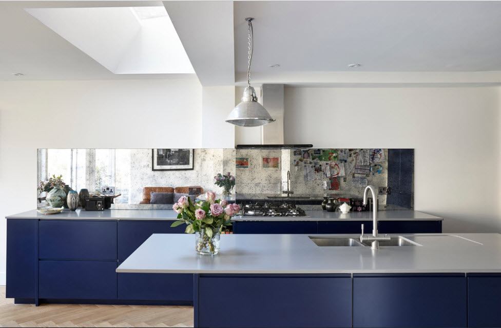 Очень органично смотрится кухонный фартук в аккомпанементе с каким-либо другим предметом интерьера, например, столешницей. В данном случае цвет, материал и фактура должны совпадать. Фартук может полностью заполнить пространство до навесных шкафчиков, а может быть всего лишь бортиком определенной высоты, что выглядит очень стильно и неординарно. Плюс такого решения в том, что к кухонному фартуку не нужно специально подбирать дополняющий элемент, ведь у него уже есть идеальный напарник – столешница.