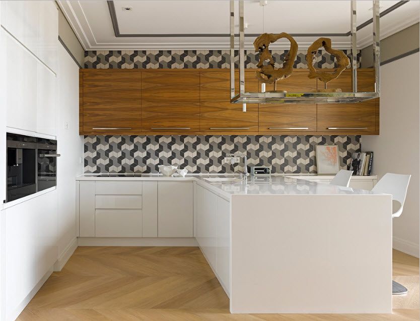 На следующем фото представлен настоящий бар со стильным дизайнерским решением. Секрет успеха – столешница, выполненная из натурального дерева, стальной смеситель и эффектная мойка. Но главная изюминка брутального дизайна – стеклянный фартук в зигзагообразном исполнении в виде шевронов.