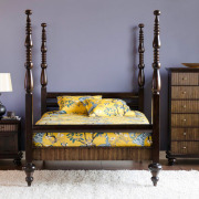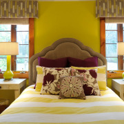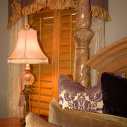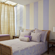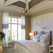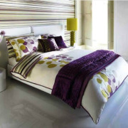 Не менее эффектно смотрятся более спокойные сиреневатые тона как в однотонном исполнении, так и в изящной фигурной отделке на подушках и покрывале.
