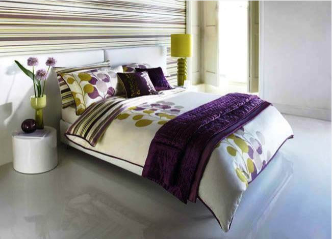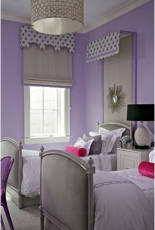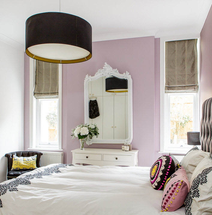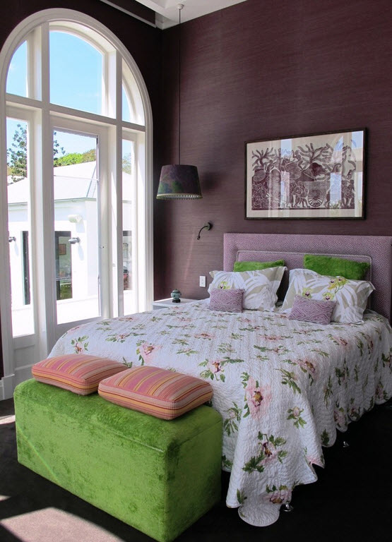 Выбирая обои или краску для стен, избегайте насыщенных, темных цветов. Не ограничивайтесь одним фиолетовым и его светлыми или темными тонами, смело комбинируйте фиолетовый с другими интересными оттенками лилового, сиреневого, алого, аметистового цветов. Также недопустимо в оформлении спальни использовать резкие контрасты, особенно для ярких палитр. Цвета должны гармонично дополнять друг друга или плавно перетекать из одного оттенка в другой.