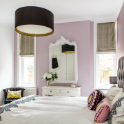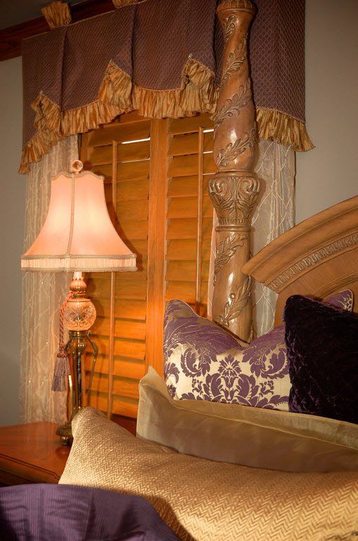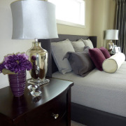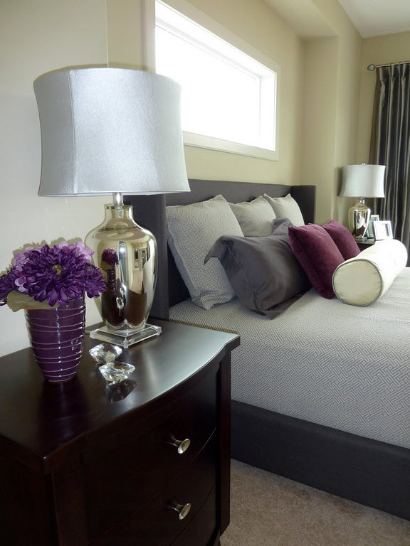 Темные фиолетовые или другие яркие акценты уместны, когда основная цветовая гамма спальни исполнена в нейтральных пастельных тонах. В таком случае яркие декоративные подушки, картина с фиолетовым вкраплением, милый ночник возле кровати или темно-пурпурный прикроватный коврик будут как нельзя кстати. Как вариант, изящным дополнением к нейтральным светлым тонам станет грациозная ваза насыщенного цвета лаванды или декоративные настенные часы в том же цветовом решении.