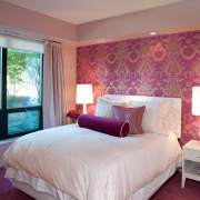 Желая добавить в декор спальни загадочные пурпурные нотки, основной акцент можно сделать на оформлении роскошной большой кровати. Благородный фиолетовый текстиль в сочетании с отделкой ромбовидного узора слегка контрастного розоватого цвета выгодно подчеркнет безупречный вкус и стиль хозяев, а ультрамодный стульчик в той же цветовой палитре станет пикантным дополнением современного интерьера.