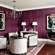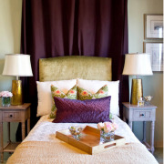 Возможно и другое решение декора, когда темные фиолетовые стены прекрасно гармонируют с пастельным текстилем молочно-бежевых оттенков.