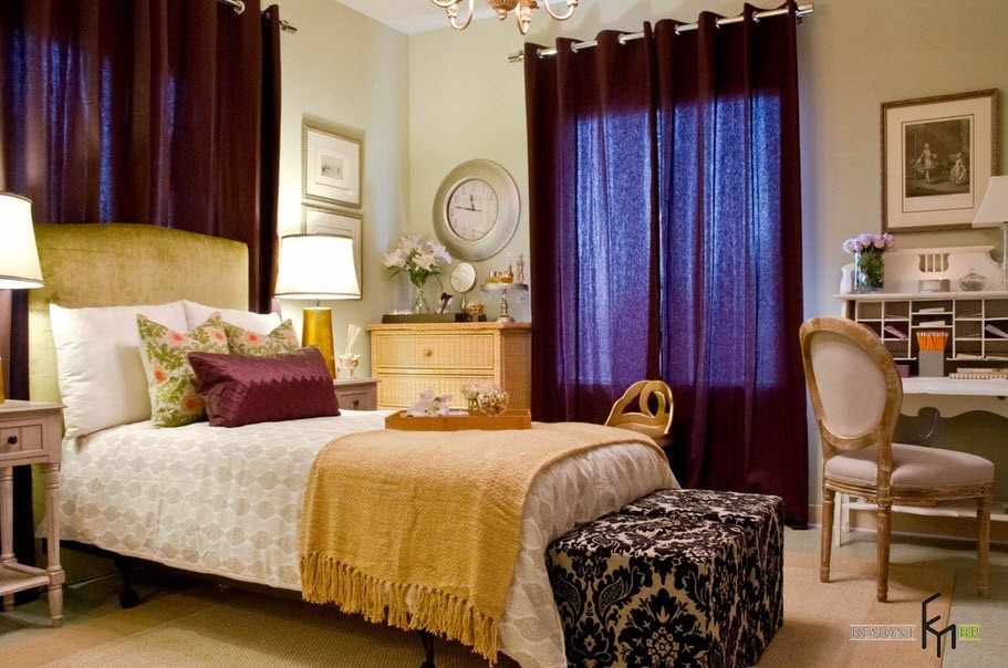 - В спальне – для ее оформления лучше выбирать портьеры из плотной, ворсистой ткани. Этот прием позволяет наполнить атмосферу помещения роскошью и уютом одновременно.