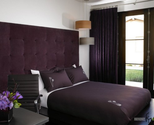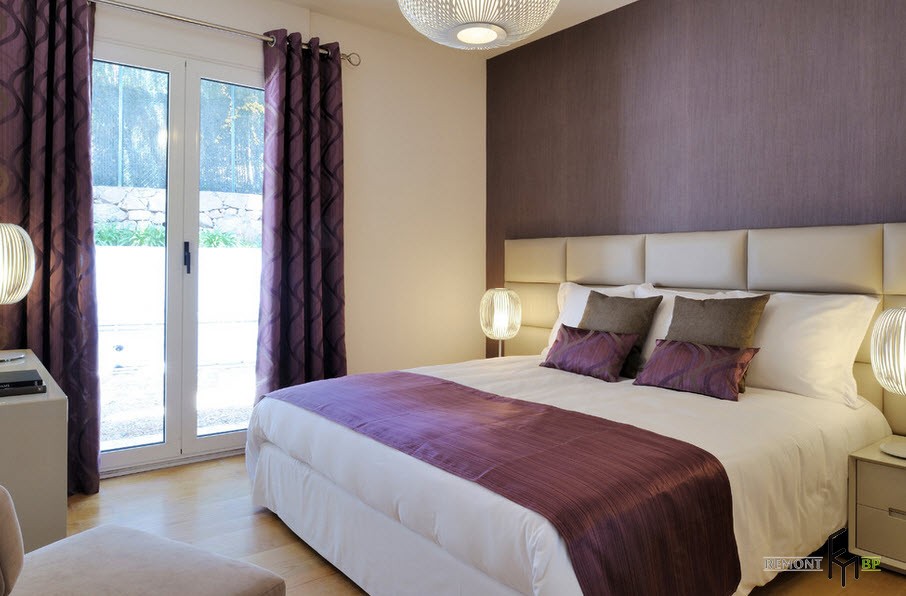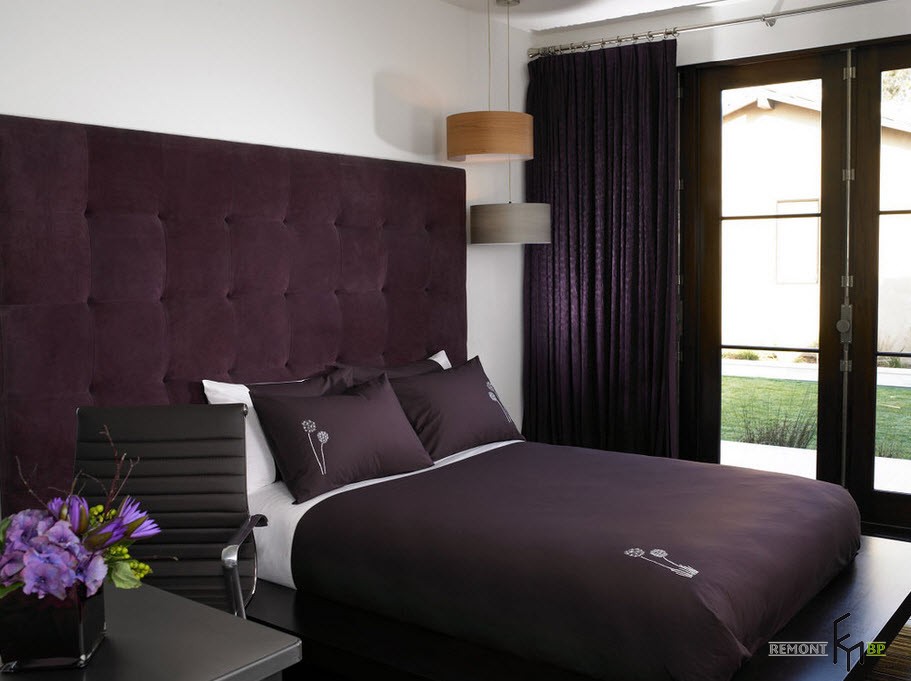 Фиолетовые однотонные портьеры или жалюзи прекрасно подчеркнут лаконичность форм минималистичного дизайна. Оттенки штор при этом можно выбирать любые: от самых темных до светлых, в зависимости от общего цветового решения комнаты. Темные лучше сочетать с более яркими цветами, а светлые – с классическими или приглушенными.