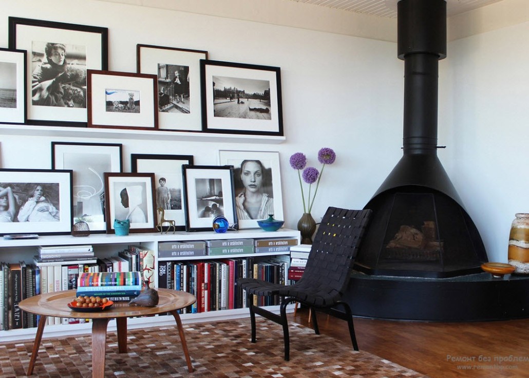 - Перед размещением фотографий на стене следует разложить их на полу, подбирая самый выигрышный вариант для каждого снимка. При украшении интерьера фотоработами маленького размера обязательно следует учесть, что такие кадры будут смотреться только в том случае, если их достаточно много.