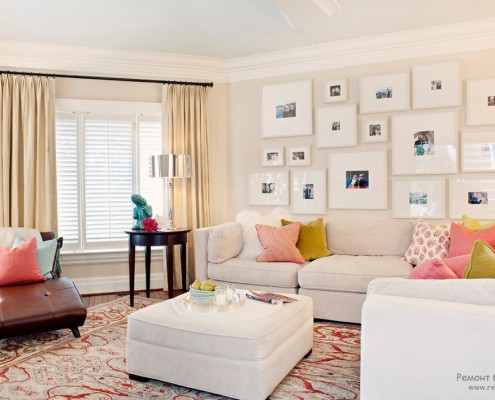 - Фотографии, «разбросанные» хаотически по стене комнаты, добавят интерьеру яркости и красочности, создадут праздничное настроение.