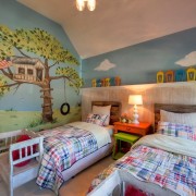 Имитация открытого окна или дверей может выглядеть очень реалистично. Благодаря новым техникам нанесения рисунков такая картинка способна создать сказочный образ комнаты. Например, это может быть ярко голубое небо с белоснежными облаками за нарисованным окном.