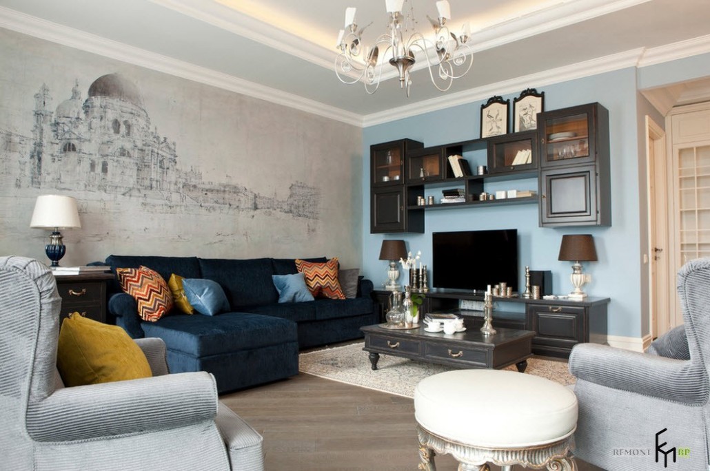 Использование фотообоев допускается в любом помещении. Самая яркая и большая гостиная только выиграет от грамотно выбранных и наклеенных полотен. В зависимости от ожиданий нужно подбирать цвет и сюжет. Реалистичные пейзажи привнесут романтики в образ комнаты. При этом это не обязательно должны быть заурядные рощи или морские мотивы. Потрясающе выглядят горные вершины, украшенные снежными шапками, или экзотические деревья на далеком острове в океане.