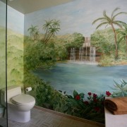 Фотообои могут занимать как часть поверхности, так и покрывать целую стену. Так часть комнаты может превратиться в потрясающий сад с райскими птицами. Поразить воображение посетителя может огромное изображение водопада. Реалистичность картинки в этом случае имеет первостепенное значение.