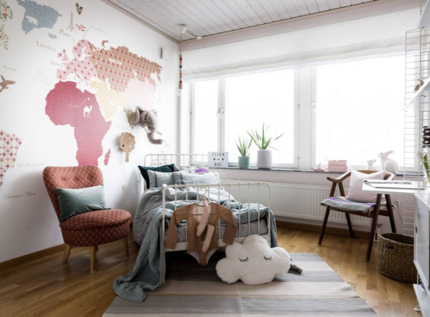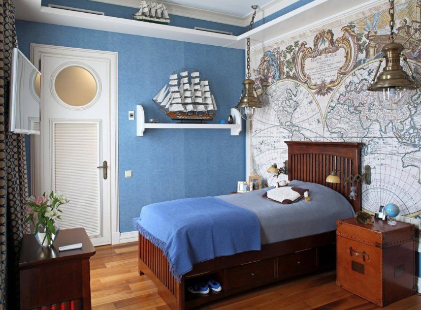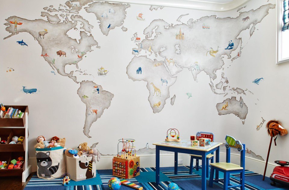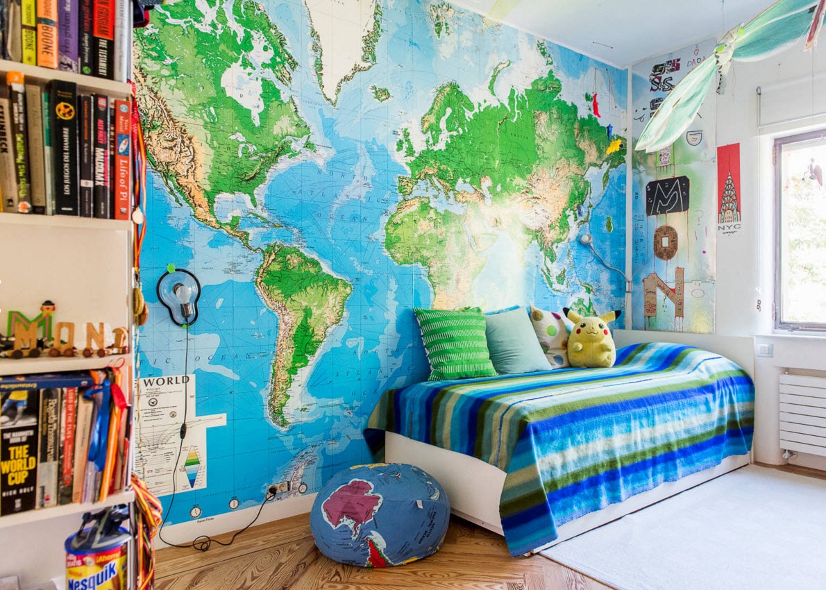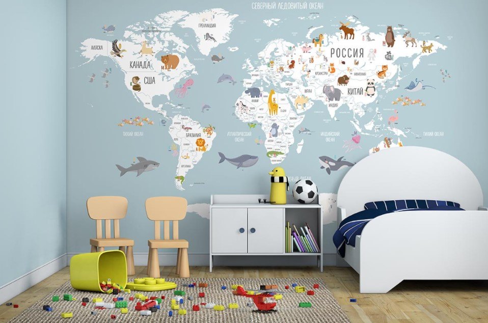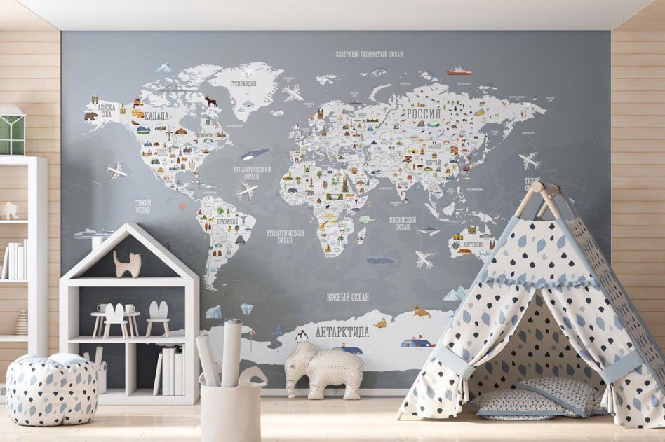 В современном мире существует множество способов украсить интерьер детской комнаты: используют разноцветные фотообои, фотообои с геометрическими фигурами и отдельными узорами. Но самым гениальным решением дизайнеров стало украшение стен полотнами, где изображена карта мира. Такой вариант дизайна – не просто красочная картинка, но и очень познавательная информация. Ваш ребенок может каждый день исследовать окружающий мир, узнавать расположение различных географических объектов, не выходя из собственной комнаты.
