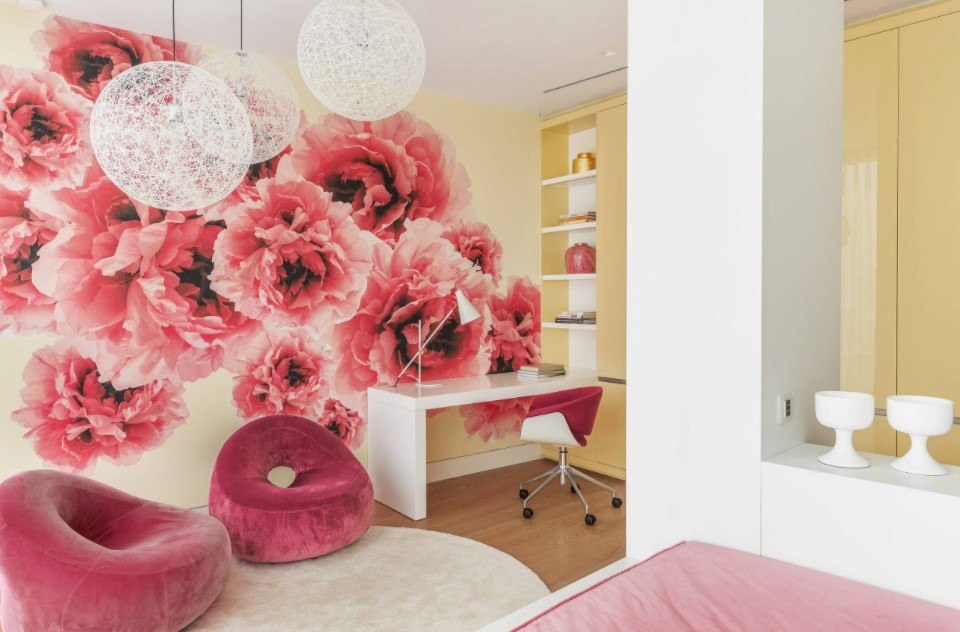 Для девочек-подростков отличным вариантом станут фотообои сочных и в тоже время, ярких оттенков (красный, желтый, светло-зеленый, фиолетовый, оливковый и песочный).