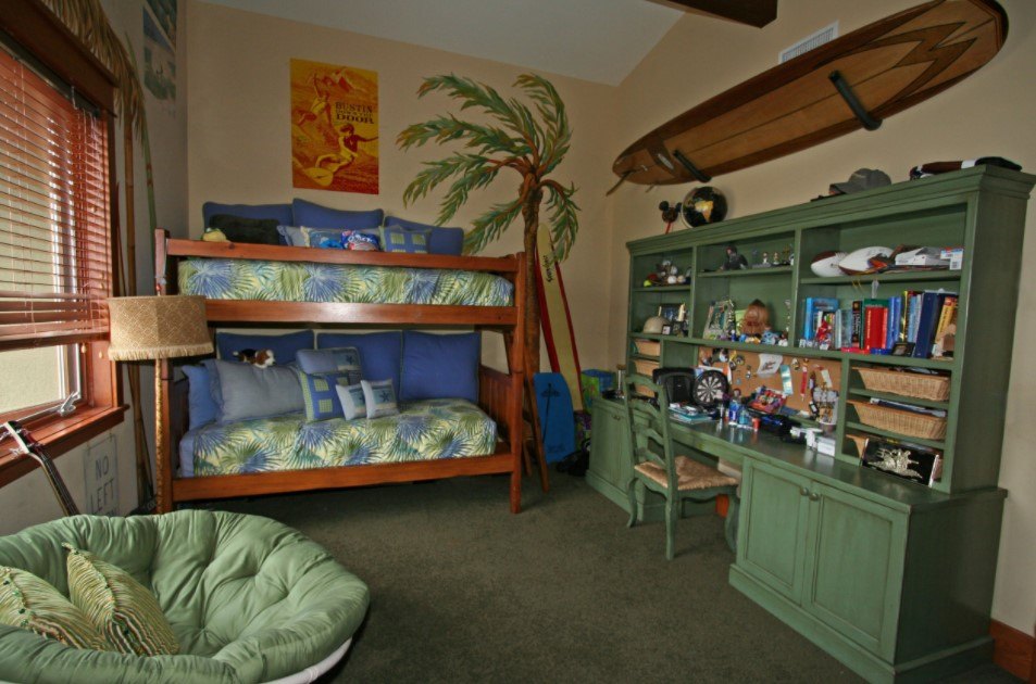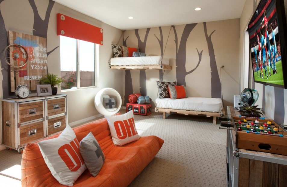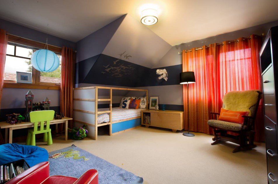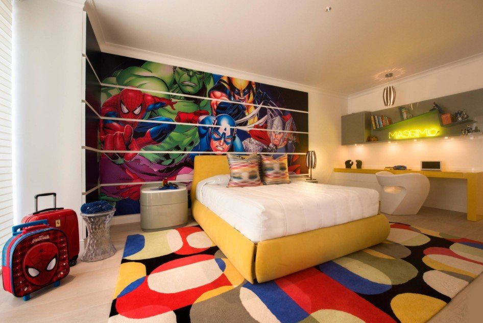 Дизайнеры рекомендуют клеить фотообои только с одной стороны стены. Таким образом создается яркий акцент, который не будет перегружать весь интерьер. Отличным вариантом стало расположение фотообоев в игровой зоне или над кроватью.