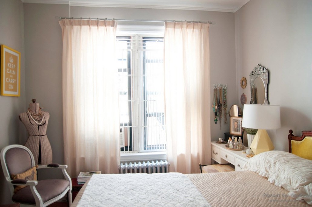 А вот аксессуарам уделяют особое внимание. Излюбленным и зарекомендовавшим себя исключительно французским аксессуаром, применяемым в декорировании спальни стал портновский манекен, который украшают всевозможными лентами, бусами и кружевами. И как не странно смотрится он здесь очень органично. Особенный шик убранству кровати придают стеганные покрывала из шикарных блестящих тканей и огромное число самых разных по форме декоративных подушек, разных тонов и оттенков, цвета которых подбираются в тон основному цветовому решению комнаты. Как правило покрывала и шторы на окне делают из одной ткани. Шторы делают тяжелыми и порой даже на подкладке, цвет которой должен совпадать с одной из подушек на кровати. Если соблюсти все эти мелочи и не упустить ни один нюанс, то вся спальня будет смотреться очень органично и продуманно.