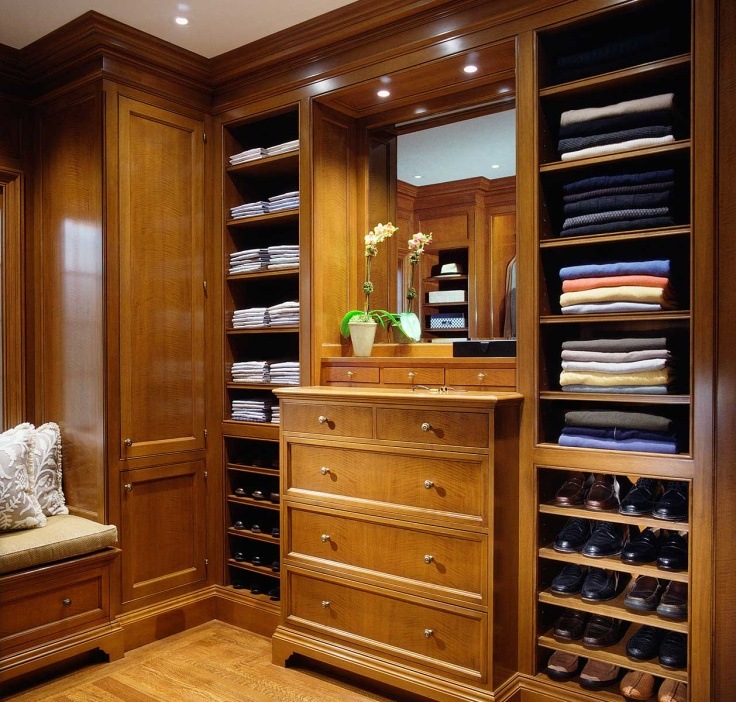 - В отличие от традиционной корпусной мебели в гардеробной должно быть место для аксессуаров и обуви. Вот почему вы должны сделать такое хранилище, где можно было бы вращаться вокруг своей оси в полный рост перед зеркалом.