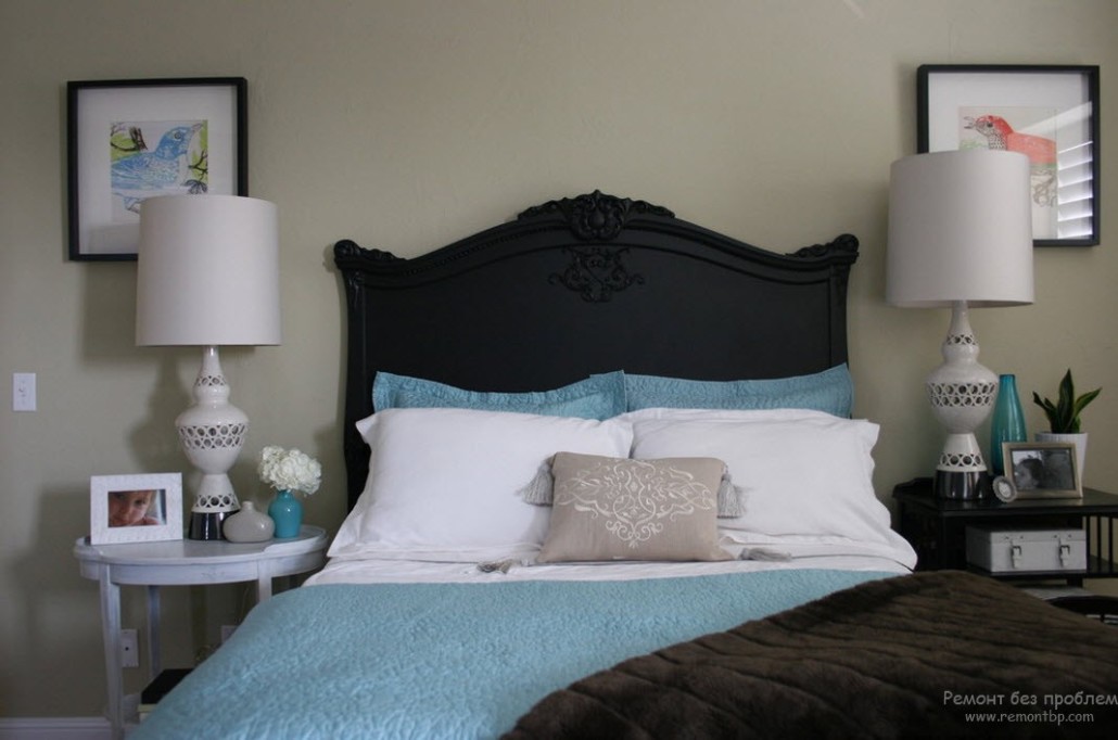 В спальне черный тон предполагается применять по соседству с другим цветом. Так, серо-голубая прозрачность льда стен будет в унисон с черной или белой кроватью, покрывалом и подушками противоположной гаммы. Пуф и стулья требуют цветовой идентичности стен, а шторы на пару тонов обязаны отличаться от стен или соответствовать покрывалу.