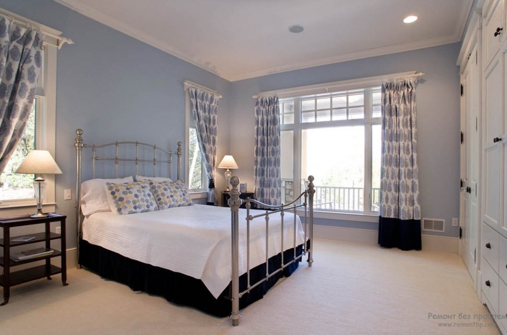 Предметы интерьера с металлическим оттенком в поддержке синих занавесей и аксессуаров, также будут замечательно смотреться на фоне голубого колера. Спальня получится в выдержанном стиле, но не будет напоминать будуар дамы бальзаковского возраста.