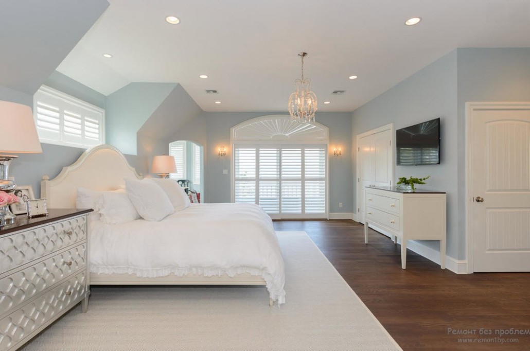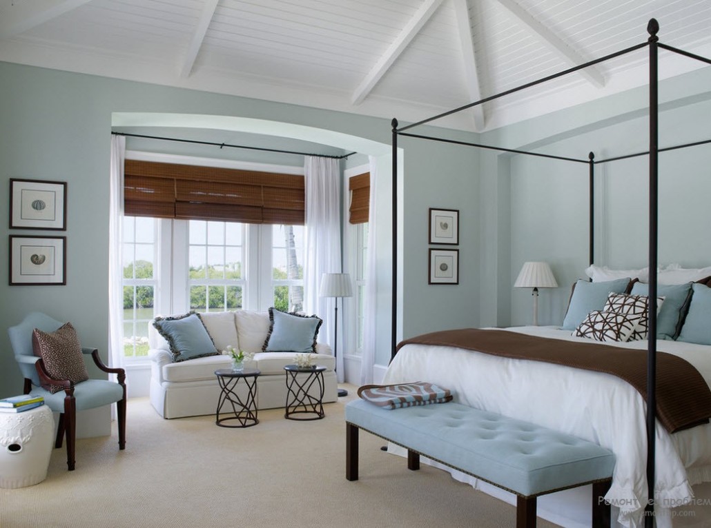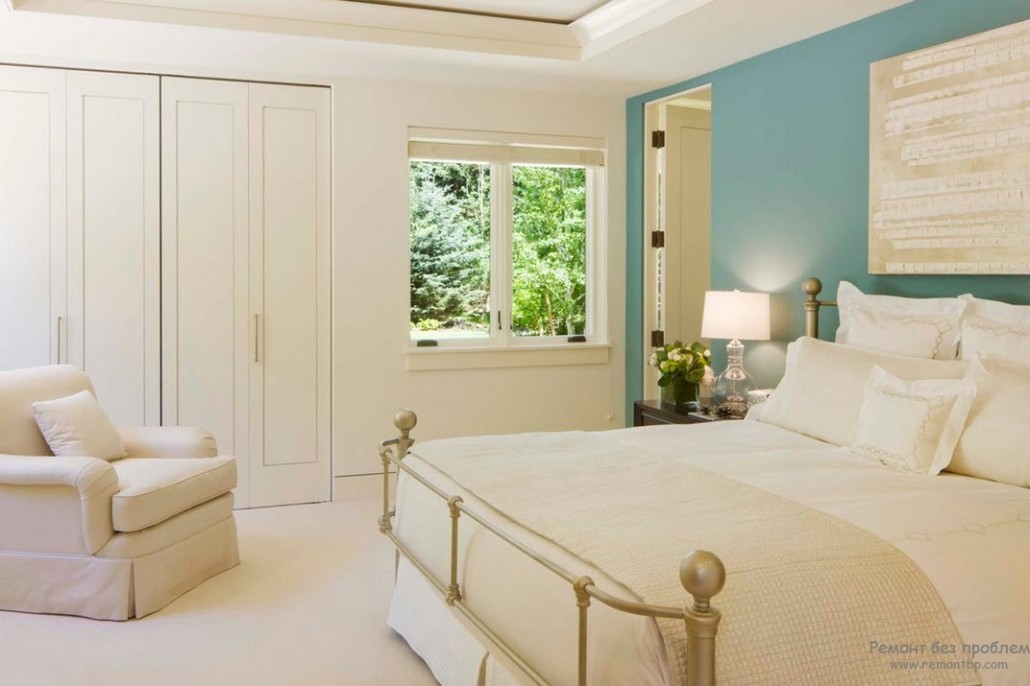 Голубой нейтральный тон, в дуэте с белым, считается универсальным вариантом. В такой комбинация спальня выглядит торжественно-нарядной и при наличии панорамного окна, пропускающего много солнца, сглаживается ощущение холодности. Предпочтение отдаем исключительно светлому фону еще и по той причине, что чрезмерная насыщенность стен губительна для страсти в постели.