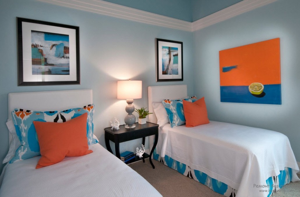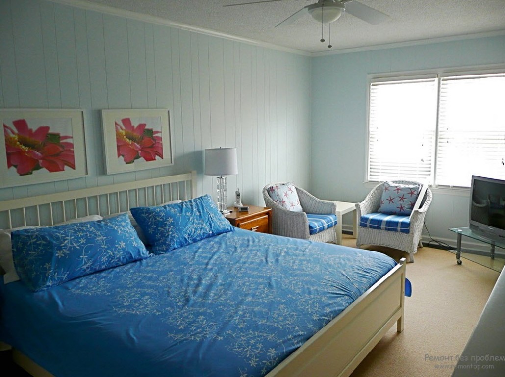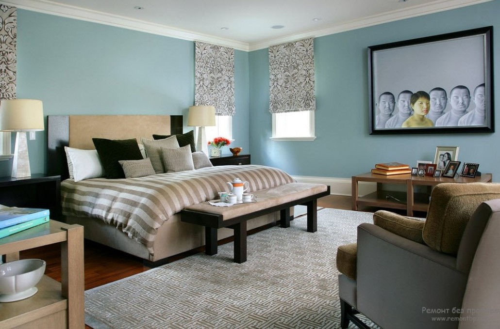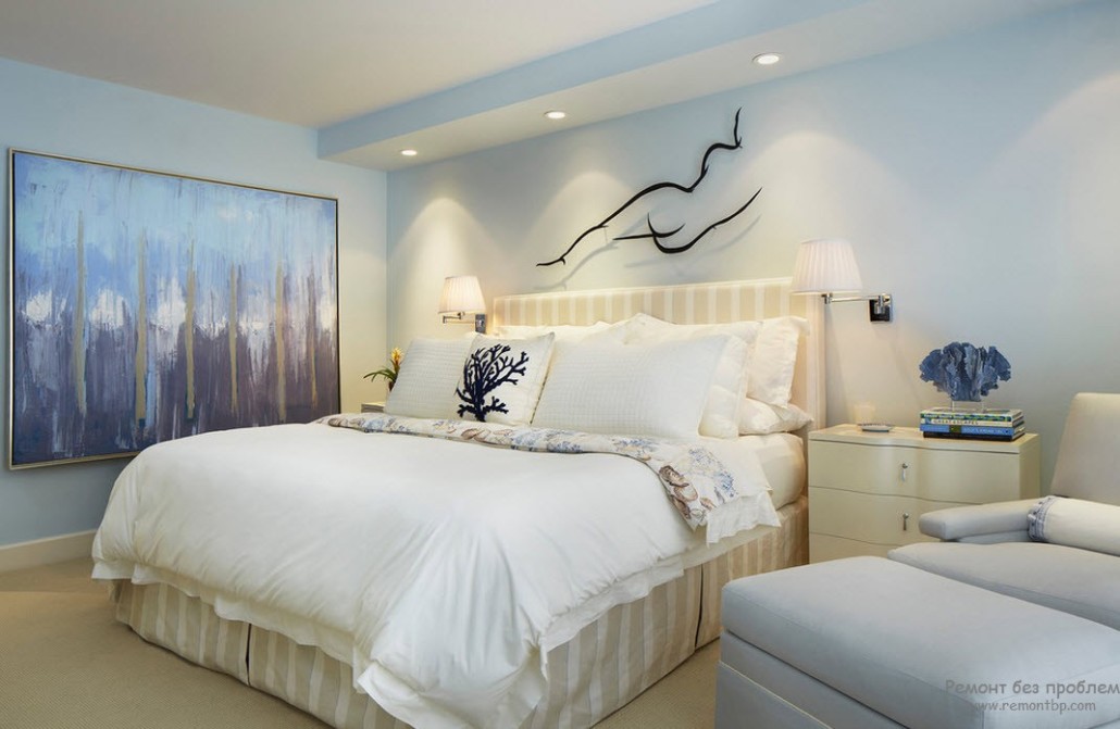 Смело сочетайте голубые стены с большими картинами, выступающими пестрыми пятнами и, тем самым, компенсируя созерцательный эффект. Но помните, что хороший вкус – это умеренность. Пару сочных иллюстраций или панорамного изображения в изголовье будет достаточно.