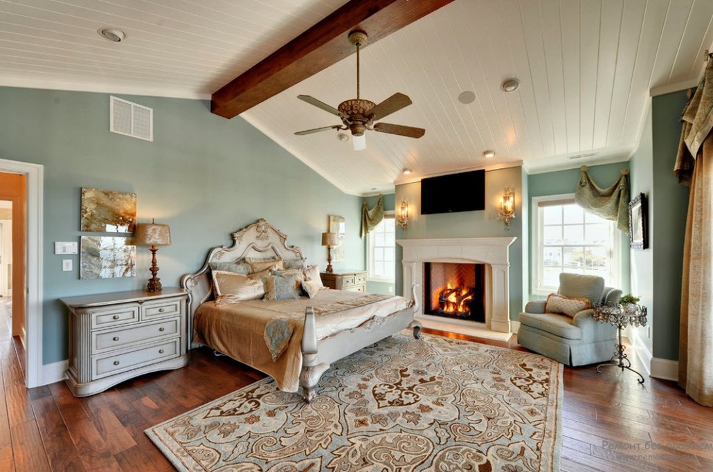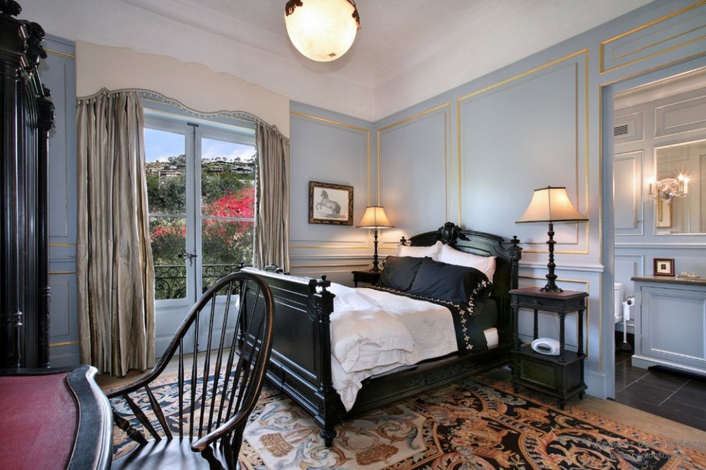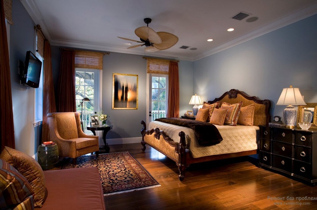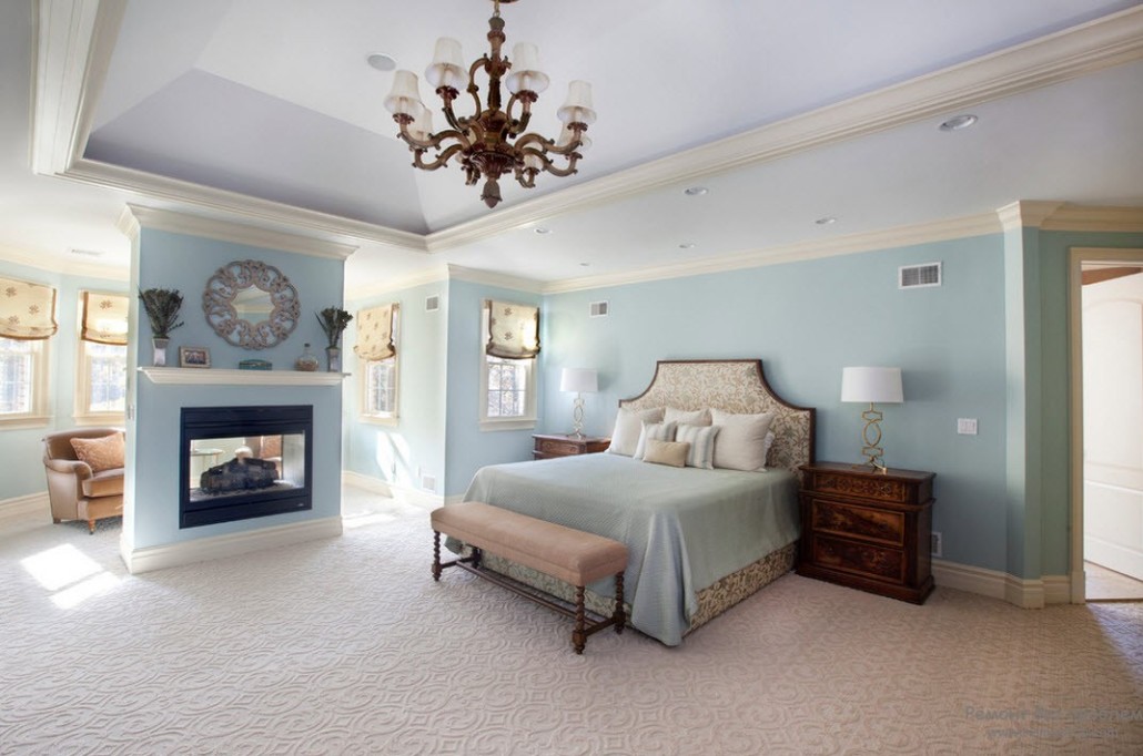 Темно-синий используется осторожно, учитывая факт того, что искусственное освещение делает цвет почти черным. Но если у вас высокие потолки и много света, то в сине-голубом дуэте и поддержке коричневой мебели спальня будет смотреться благородно. Причем стены красятся в нежно-голубой, используется текстиль цвета морских глубин, и на фоне деревянной мебели интерьер будет перекликаться с классическим стилем.