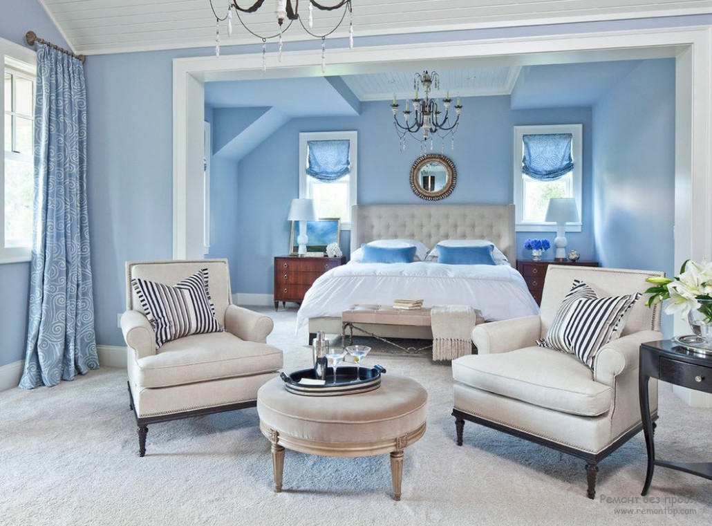 Для спальни рекомендована «цветовая прохлада» по причине соответствия физиологического комфорта и крепкого сна, поэтому голубые стены будут более чем уместны. Но среди проявленного спектра есть агрессивные тона, влияющие не лучшим образом на визуальное восприятие. Это происходит вследствие преобладания их глубокой насыщенности, приближенных к синеве. Поэтому следует придерживаться конкретных правил, чтобы соблюсти гармонию, о которых чуть позже.