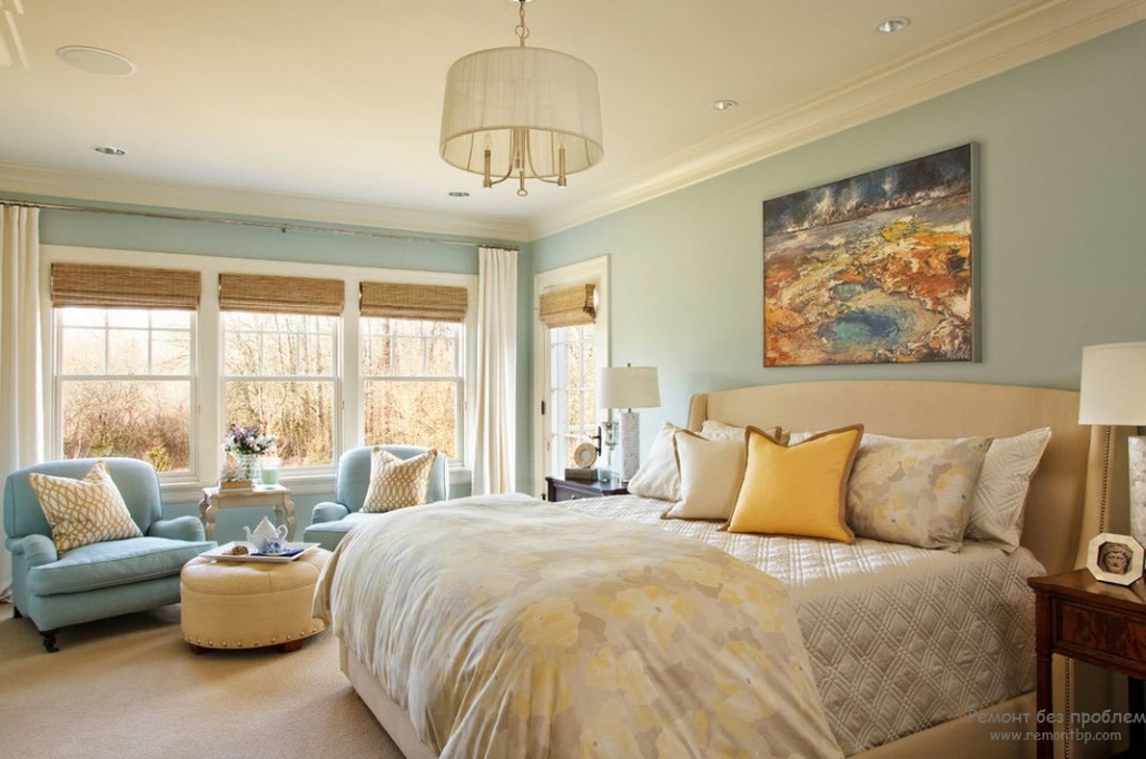На помощь приходят легкая голубизна стен и бежевый текстиль для драпировки. Шторы можно свободно заменить сдержанной лимонной и желтой гаммой. В любом случае оба колера позволительны с позиции колористики.