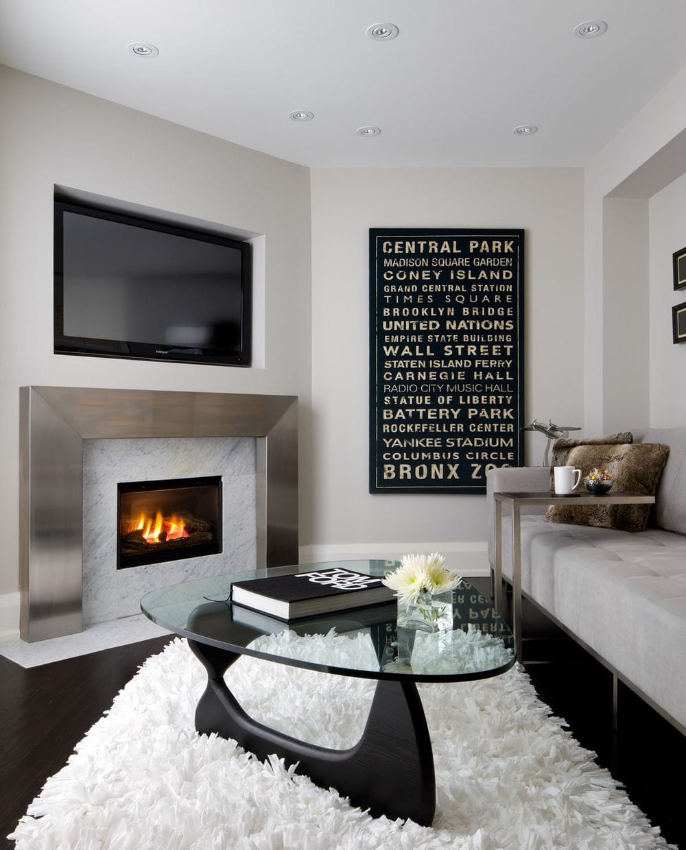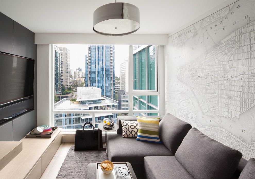 Освещение в гостиной — важный момент. Начните с потолка. Подумайте о том, нужна ли вам висящая лампа в центре? Потолочное освещение в гостиной не должно вредить вашим глазам и подавлять зрение. Точечные светильники могут быть установлены вдоль темной стены и мини-кухни. Пользуется популярностью настенное освещение в расположении гостиной в виде бра, которое полезно для осветления больших поверхностей, фото-галерей, мебели. Не забудьте о торшере или прикроватной лампе, которые можно поместить около журнального столика, шкафа или телевизора.