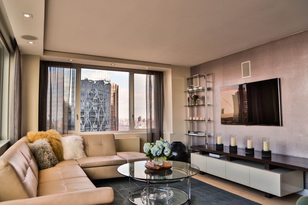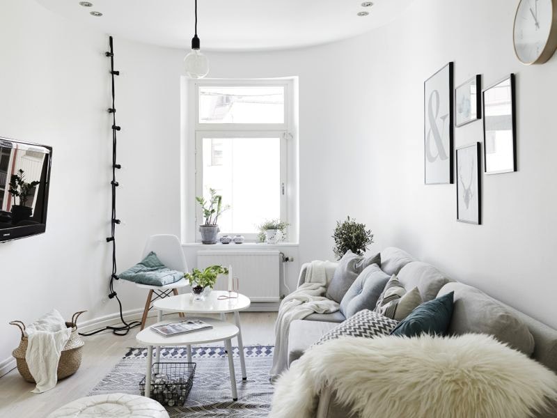 Телевизионный уголок занимает важное место в расположении гостиной. Где его установить? Лучшее место для телевизора в гостиной 17 кв. — это стена от окна (а не наоборот, потому что отражающие солнечные лучи затрудняют просмотр телевизора). Диван должен быть расположен по отношению к технике, по крайней мере, на трех диагоналях экрана. На какой высоте разместить телевизор? Чтобы определить это, учтите среднюю высоту зрителей и дивана. Стандартные телевизоры устанавливаются на 100-110 см над полом.