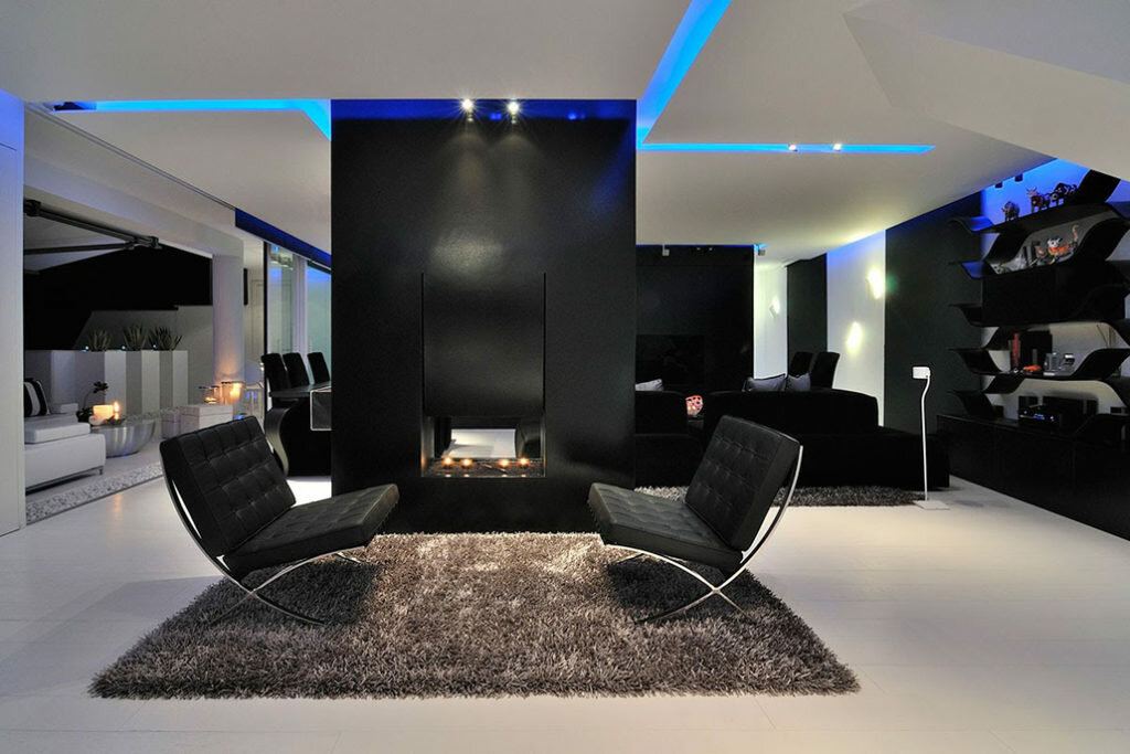 Смелые цветовые сочетания доминируют в высокотехнологичных интерьерах. Чаще всего они бывают черно-белыми, иногда с добавлением серого или темно-синего цвета, контрастно сложенных на больших плоскостях. Стилю хай-тек нужно пространство, поэтому он совсем не подходит для небольших квартир. На фоне ранее упомянутых цветов отлично смотрятся другие элементы дизайна интерьера, выполненные из таких материалов, как сталь, стекло, хром или алюминий.
