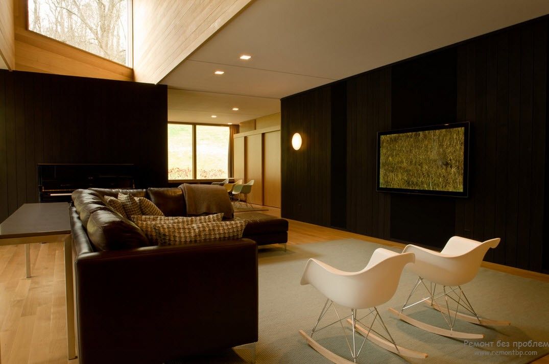 Включение в интерьер тёмных оттенков коричневого служат для создания в зоне отдыха атмосферы, располагающей к релаксации и медитации.