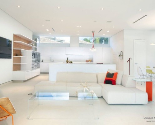 Когда речь заходит о белом цвете, необходимо помнить, что он обладает широким диапазоном оттеночных вариаций, способных к свечению или многократному отражению. Контраст обеспечивается некоторыми декоративными деталями, которыми ни в коем случае нельзя злоупотреблять. Окрашенная деталь может быть красной или фисташковой и представлена в ковре, подушках или какого-то одного объекта.