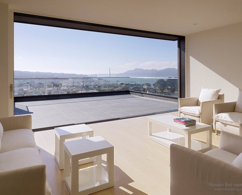 раздвижные двери, деревянное покрытие пола и использование панорамного вида как элемента интерьера,