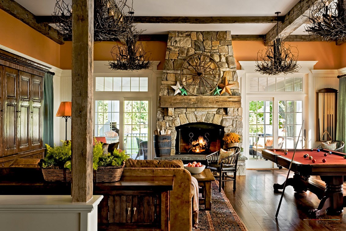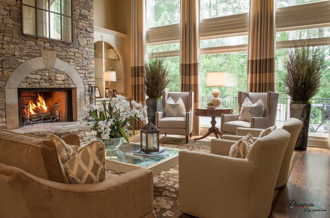 Прежде всего, говоря о гостиной в загородном доме, на ум приходит главный центр домашнего очага – это камин, который собирает вечерами всех членов семьи, а также, друзей, даря свое тепло и уют.
