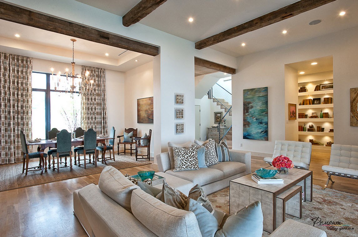 Также прекрасно подойдут комплекты модульной мебели, которая легко меняется местами при необходимости. Если гостиная объединена со столовой, то следует подобрать оригинальный обеденный гарнитур, способный подчеркнуть гармонию, тепло и уют загородного дома. Дополнить интерьер гостиной помогут яркие большие картины с любой тематикой. Если имеется обеденная зона, то натюрморты подойдут как нельзя кстати.