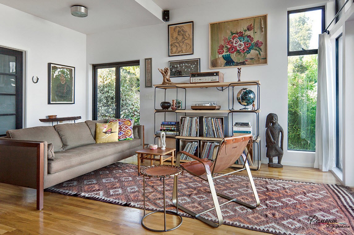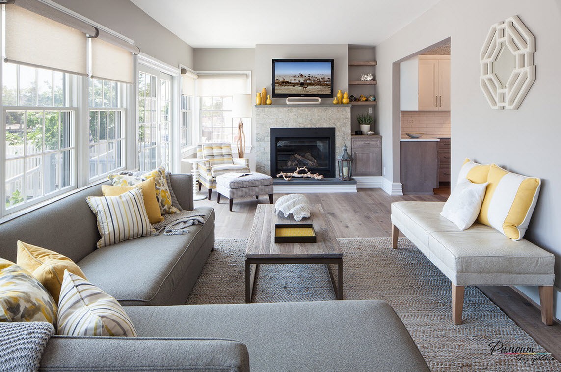 Относительно цветовой гаммы – можно особо выделить интерьеры гостиных в светло-коричневых, золотистых, серо-голубых тонах с применением ярких декорирующих элементов: ковры, подушки, настенные панно, картины и прочее.