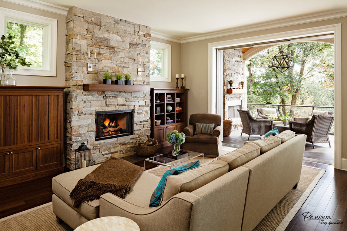 Если в гостиной имеется камин, то желательно выложить камнем или плиткой площадь вокруг него, т.к. могут лететь искры и вываливаться угли. Можно также использовать и ламинат или натуральную древесину.