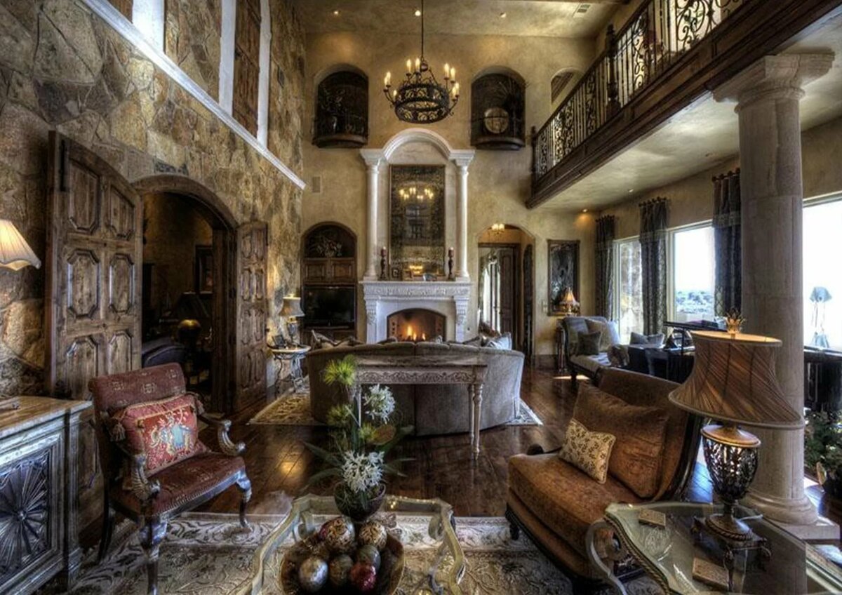 Основным элементом готической гостиной является массивная кованая люстра, которая обеспечивает достаточное количество света. Камин с кованым декором из металла добавляет тепла и уюта. Стены украшены гобеленами, фресками и лепниной, а на полу лежат роскошные ковры.