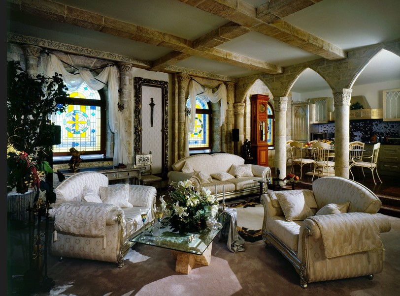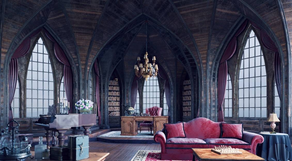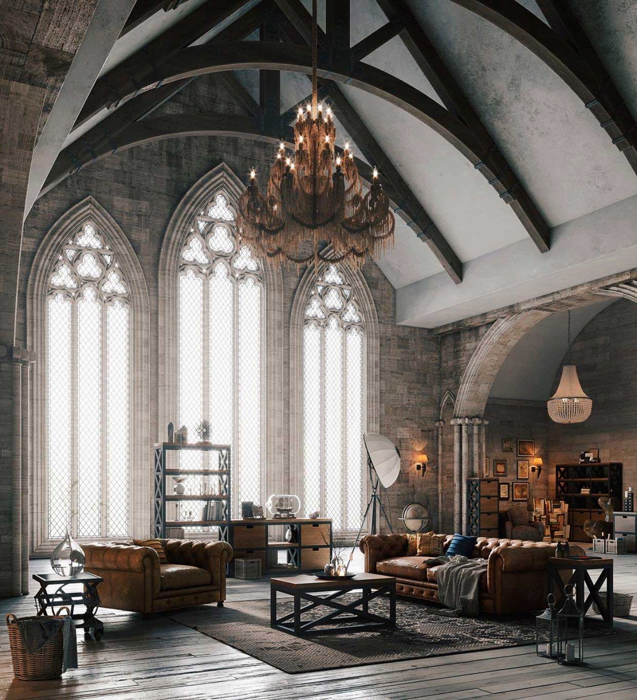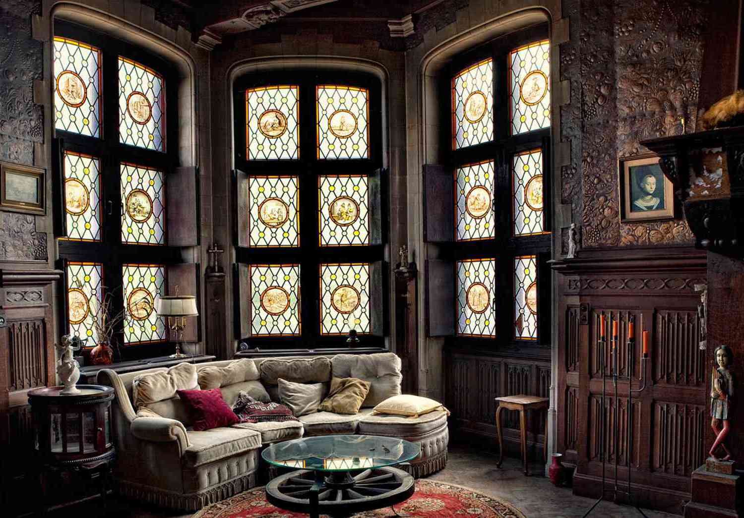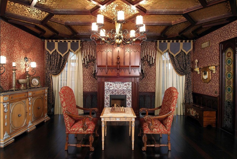 Мебель в готической гостиной выполнена из дерева и металла, имеет причудливые формы и заострённые силуэты. Окна и дверные проёмы обрамлены камнем, что создаёт эффект готики.