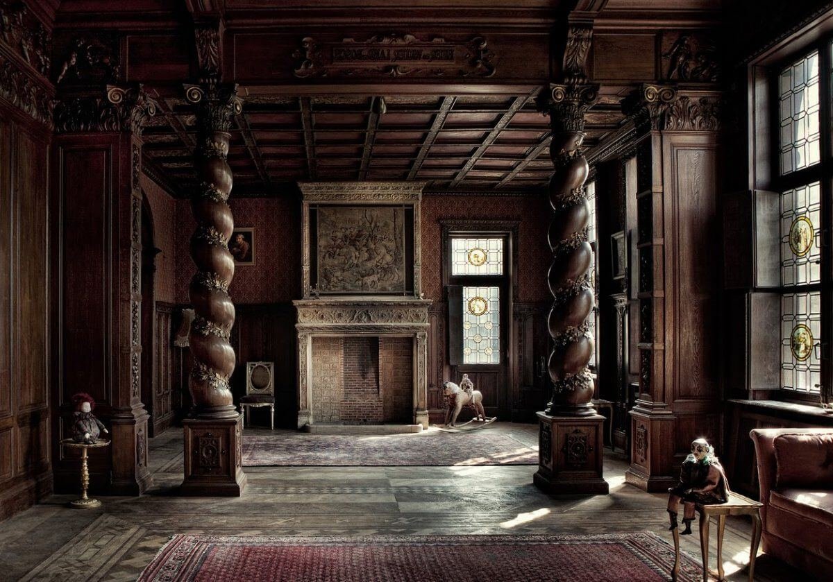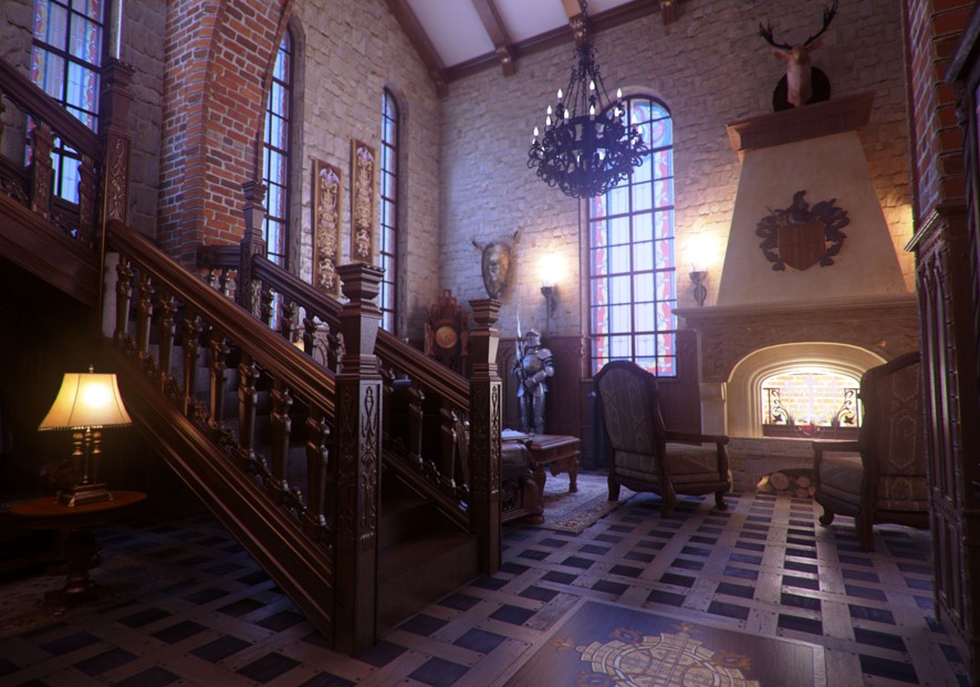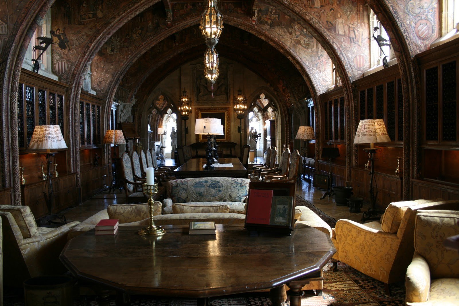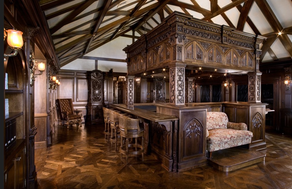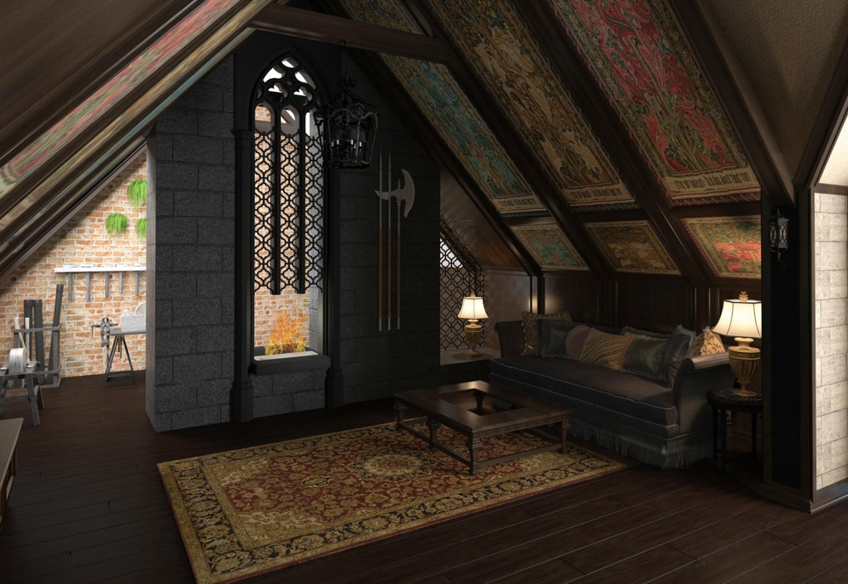 Мебель в готической гостиной выполнена из дерева и металла, имеет причудливые формы и заострённые силуэты. Окна и дверные проёмы обрамлены камнем, что создаёт эффект готики.
