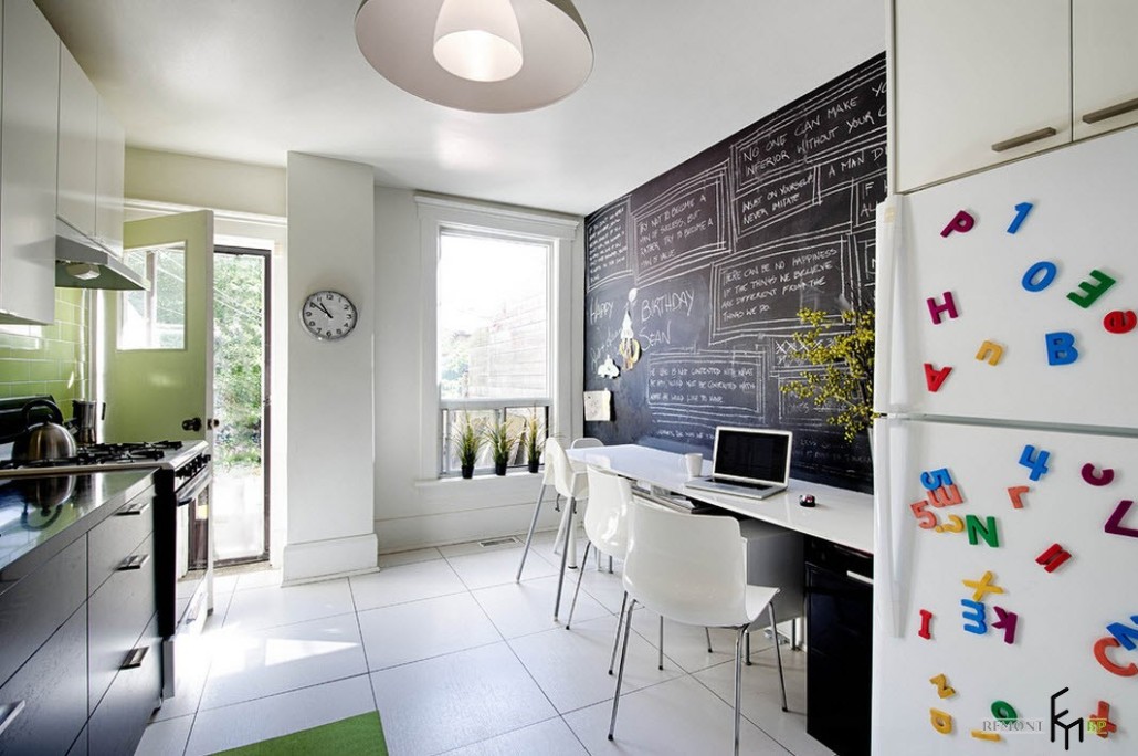 Казалось бы, а что делать меловой доске на кухне? А вспомните, милые хозяюшки, как часто мы что-то забываем приготовить к общим семейным застольям, например, к Новому Году, Пасхе или к чьему-то Дню рождения. Постоянно в последний момент забывается семейный рецепт, не хватает последней мачки майонеза и кажется, что весь мир рушится. Ничего подобного не случилось, если бы вы держали под ругой подобную «записку на холодильник». Ваши записи всегда будут бросаться в глаза, и забыть что-либо станет просто невозможно. Кроме того, грифельная или меловая доска снова станет прекрасным элементом интерьера — ведь те же списки можно будет оформить так, как захочет душа хозяюшки, в тон кухне или же, наоборот, намного контрастнее, чтобы доска выделялась? Всё в ваших руках. А когда масштабных готовок не ожидается, а холодильник забит продуктами, доску можно использовать как холст, нарисовав там какие-нибудь милые рожицы, или же написав пожелания своим близким.