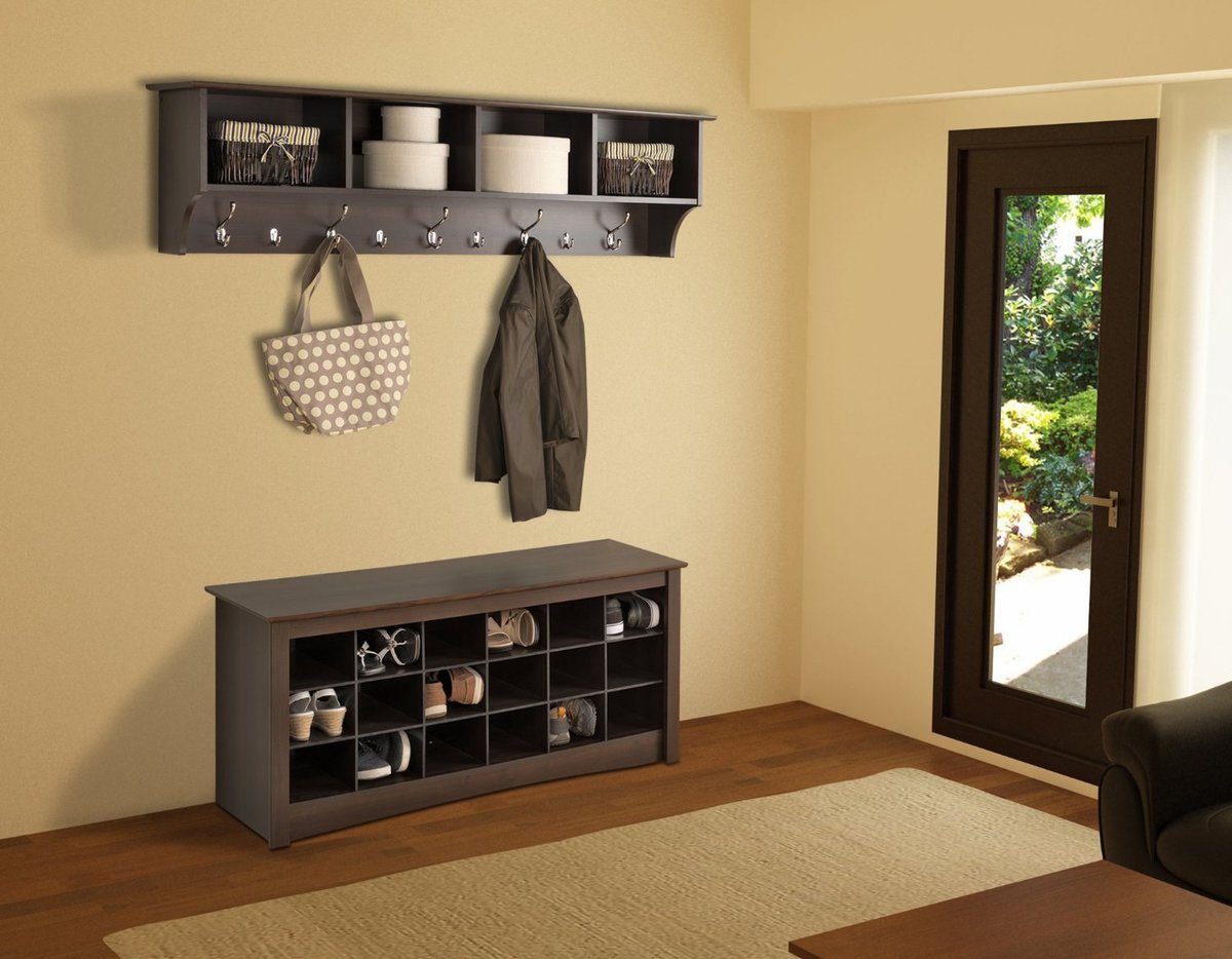 Эргономичным решением может стать обувница, совмещенная с мягким сиденьем, расположенным на поверхности конструкции. Также обувница может быть частью мебельной конструкции, в которую помимо нее входят полка для аксессуаров, открытая вешалка и небольшое зеркало.