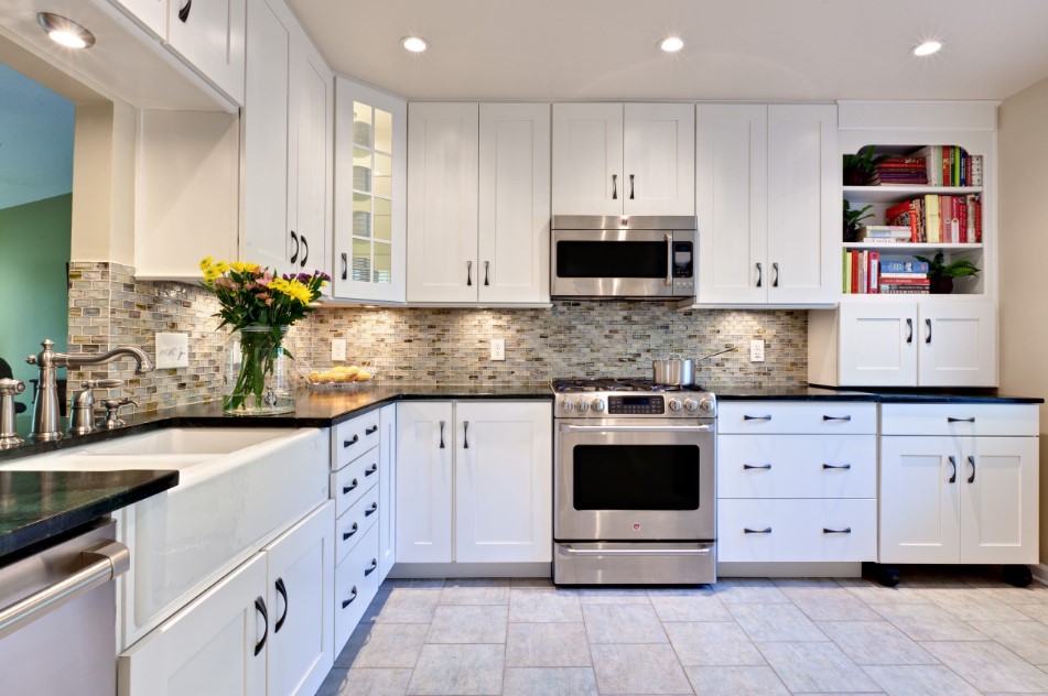 Белый цвет считается стандартным и распространенным цветом для кухни, он может быть не лучшим вариантом для большой кухни. Белый можно использовать в маленьких кухнях, но на больших площадях может быть очень холодно. Если вы выбираете белый, сочетайте его с теплым оттенком, даже если это просто акцентная деталь, например, ручки и дверные проемы, или контрастируйте с теплым деревянным полом.